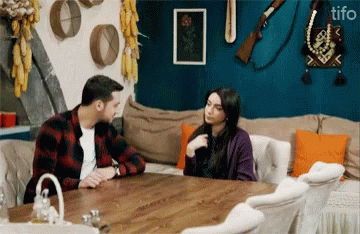 Man and Öykü share a fist bump at a rustic table, engaging in a friendly conversation.