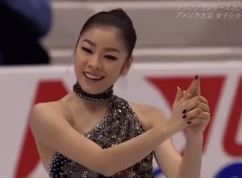 Figure skater Yuna Kim (김연아) smiling and clapping after her performance, wearing a dazzling costume.