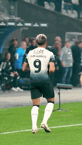 Yuri Alberto, wearing his number 9 Corinthians jersey, celebrates on the field after a game.