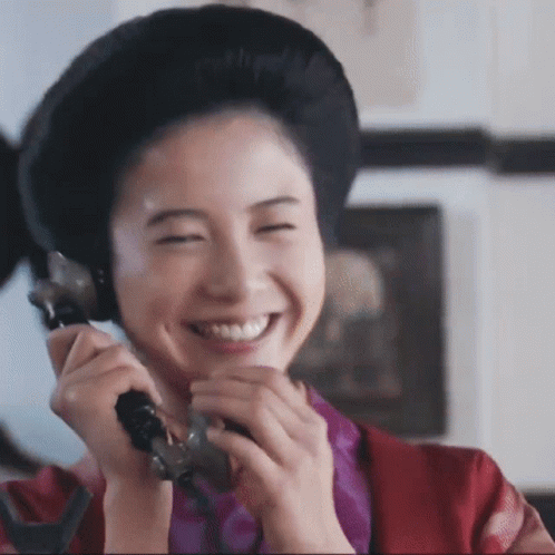 Japanese actress Yuriko Yoshitaka smiles brightly while holding a vintage telephone receiver in a J-Drama scene.