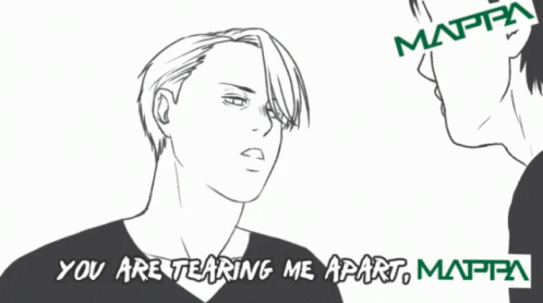 Yurionice character Victor Nikiforov expresses distress, exclaiming 'YOU ARE TEARING ME APART, MAPPA' in a dramatic scene.