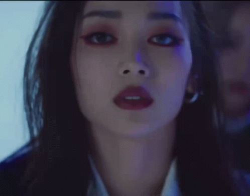 Yurjin Xc in a dramatic close-up, featuring bold red eyeshadow and dark lipstick in a blue-lit setting.