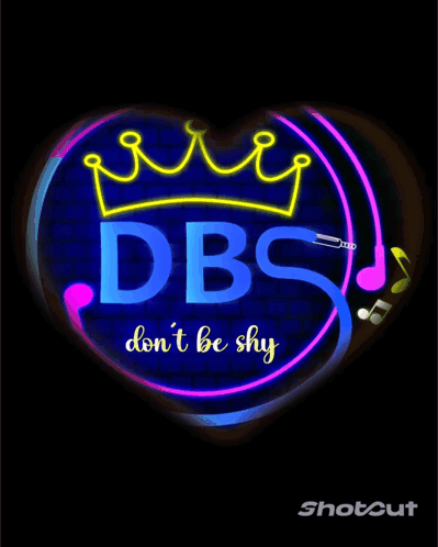 Animated neon-style logo for 'Yuyin DBS' featuring a crown, 'don't be shy' text, and musical notes.