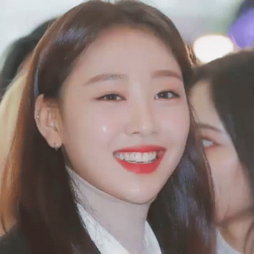 Yves from Loona with a bright, happy smile, wearing red lipstick in a close-up shot.
