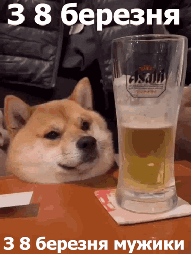 A Shiba Inu dog smiles widely next to a glass of Asahi beer, with text wishing 'Happy March 8th, guys'.