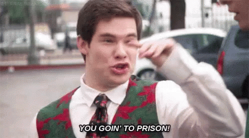 Adamn De Vine in a Christmas vest, pointing and saying 'YOU GOIN' TO PRISON!' (Z Formation Snap).