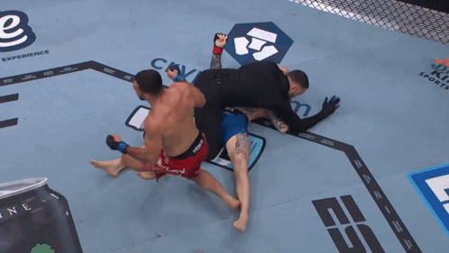 a man in a ufc shorts is laying on the floor