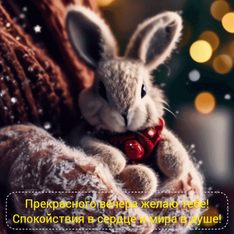 A cozy image of a fluffy stuffed bunny held in warm, knitted hands, wishing a wonderful evening and peace.