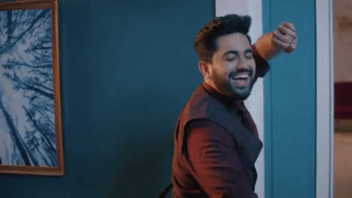 Zain Imam, known as Agastya, dances happily and energetically in a room with a framed tree picture.