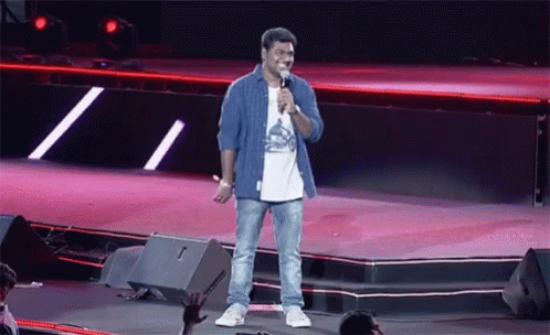 Zakir Khan, the Indian comedian, performs live stand-up comedy on stage with a microphone in hand.