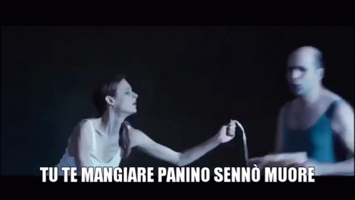 Checco Zalone comically insists a woman eat a porchetta sandwich, warning her about being too skinny.