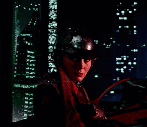 Zam Wesell, the bounty hunter, looks out at a futuristic city skyline at night.