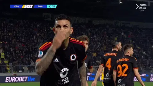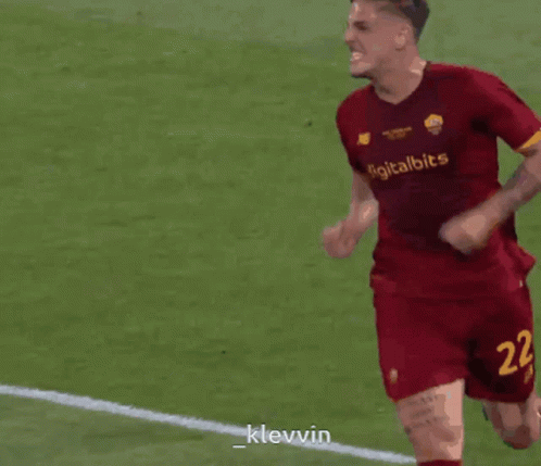Nicolo Zaniolo, wearing an AS Roma jersey, passionately celebrates a goal on the soccer field.