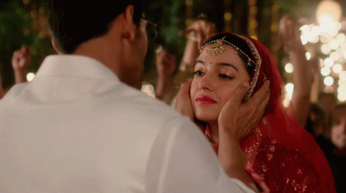 Divya Khosla Kumar as Vidya, a blushing bride, shares a tender, romantic moment with a man, looking into his eyes.