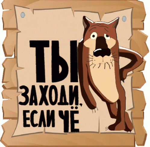 A cartoon wolf on a wooden sign with the Russian phrase 'Заходи если что' (Drop by if you need anything).