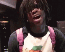Zay Sosa makes a funny face and hand gesture, showcasing his drippy style in a black shirt and pink backpack.
