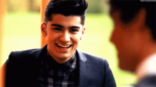 Zayn Malik smiling broadly and laughing while wearing a suit and plaid shirt.