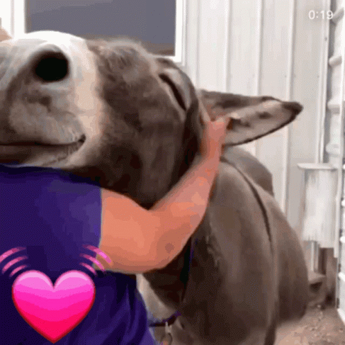 A person shares a warm hug with a happy donkey, showing affection with a pink heart overlay.