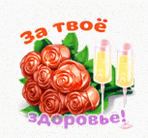 A vibrant animation of red roses and two champagne glasses, with a toast 'For your health!' in Russian.