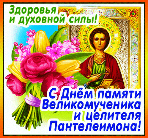 A vibrant greeting card celebrating the Day of Remembrance of the Great Martyr and Healer Panteleimon, featuring a bouquet of flowers and his icon.