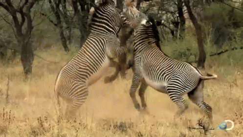 Two zebra stallions rear up and fight in a dusty African savanna, kicking up dirt during their intense confrontation.
