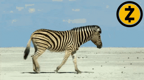 A zebra walks across a vast, sandy plain under a clear sky, featuring the Zcash cryptocurrency logo.