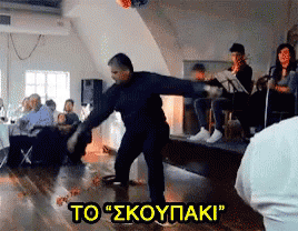A man performs the traditional Greek Zeimpekiko dance, specifically the 'Skoupaki' move, for an audience.