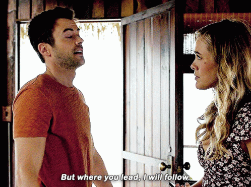 Zeke Landon and Michaela Stone share a tender moment, with Zeke saying, 'But where you lead, I will follow.'