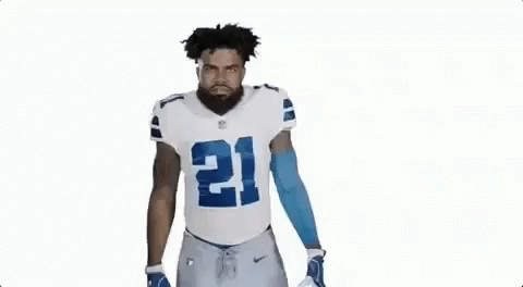 Dallas Cowboys player Ezekiel Elliott, wearing jersey #21, flexes his muscles for the camera.