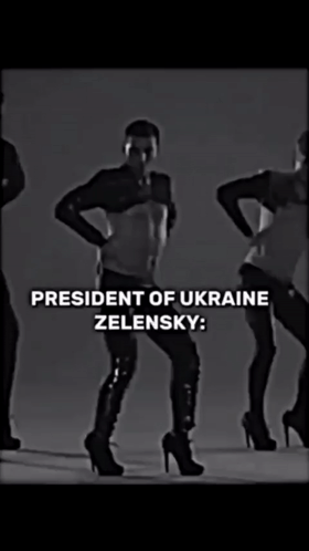 Volodymyr Zelensky's energetic dance performance in a black and white clip, wearing high heels and shiny outfits.