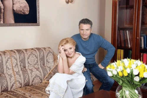 Singers Angelika Varum and Leonid Agutin pose together on a couch, with a vase of yellow tulips nearby.