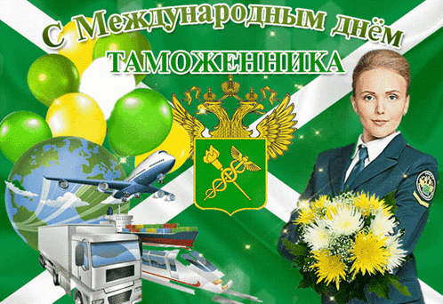 A woman customs officer holding flowers, celebrating International Customs Officer Day with transport motifs.