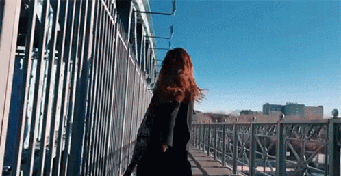 Ukrainian singer Anna Sedokova happily running and jumping on a bridge with red hair.