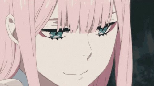 Zero Two, a pink-haired anime character from Darling in the Franxx, with striking green eyes and a subtle smirk, associated with Nine Iota.