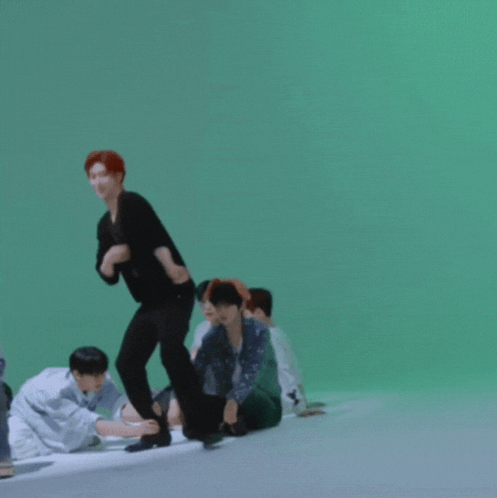 Zerobaseone's Ricky energetically runs and jumps on a green screen set, with other ZB1 members in the background.