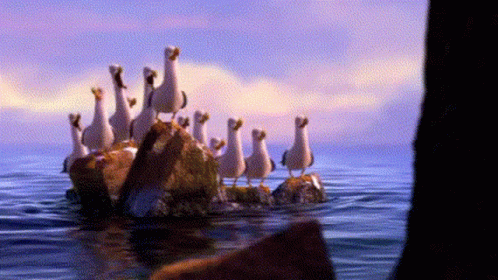 A flock of animated seagulls from Finding Nemo repeatedly call out 'Zeubi' while standing on rocks in the ocean.