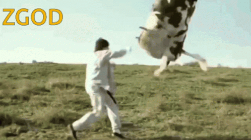 A man in white karate-kicking a person in a cow costume, with 'ZGOD' text visible in a humorous outdoor scene.