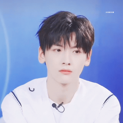 Zhai Xiaowen of R1SE makes a cute pouting face against a blue background.
