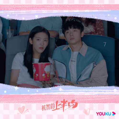 Zhang Ruonan and Zhai Zilu share popcorn and a drink during a cozy movie date in a theater.