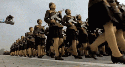 North Korean women soldiers in uniform march in formation with rifles during a parade.