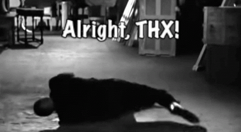 Zhivago1955 reacts with 'Alright, THX!' while lying on the floor in a black and white scene.
