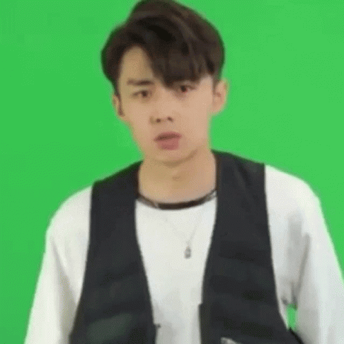 Zilu Zhai makes a cute 'shhh' gesture and points forward in front of a green screen.