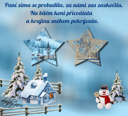 Lady winter woke up, covering the landscape with snow, featuring a cozy house and a cheerful snowman.