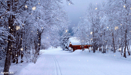 A serene winter landscape featuring a snow-covered forest, a cozy red cabin, and falling snow.