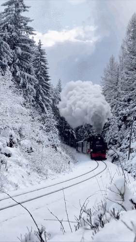 A majestic steam train chugs through a snow-covered forest, billowing thick white smoke into the cold air.
