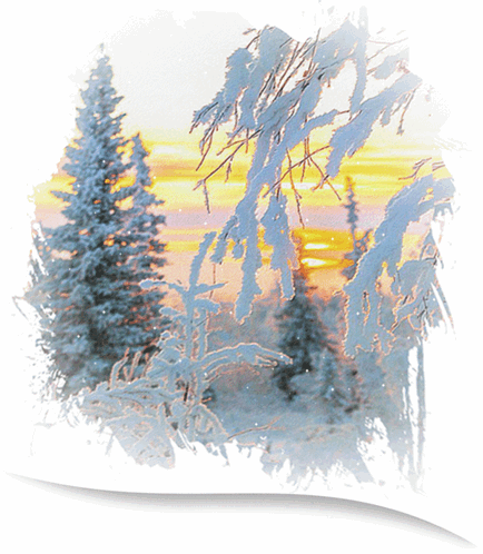 A serene winter landscape featuring snow-covered pine trees bathed in the warm glow of a sunset.