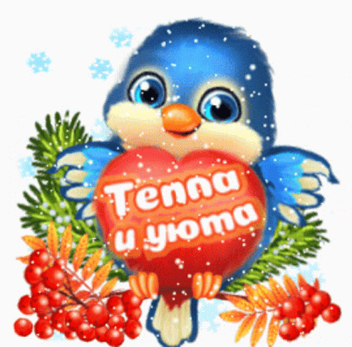A cute blue bird holds a red heart with 'Warmth and comfort' in Russian, surrounded by snow and berries.