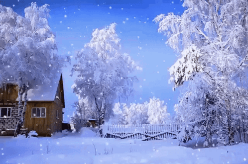 A beautiful winter landscape featuring a cozy house, snow-covered trees, and gently falling snow.