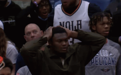 Zion Williamson reacts with a shocked expression, holding his head in his hands during a game.