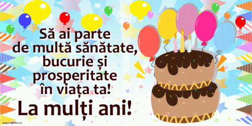 Festive birthday card featuring a cake, colorful balloons, and a 'Happy Birthday' message.
